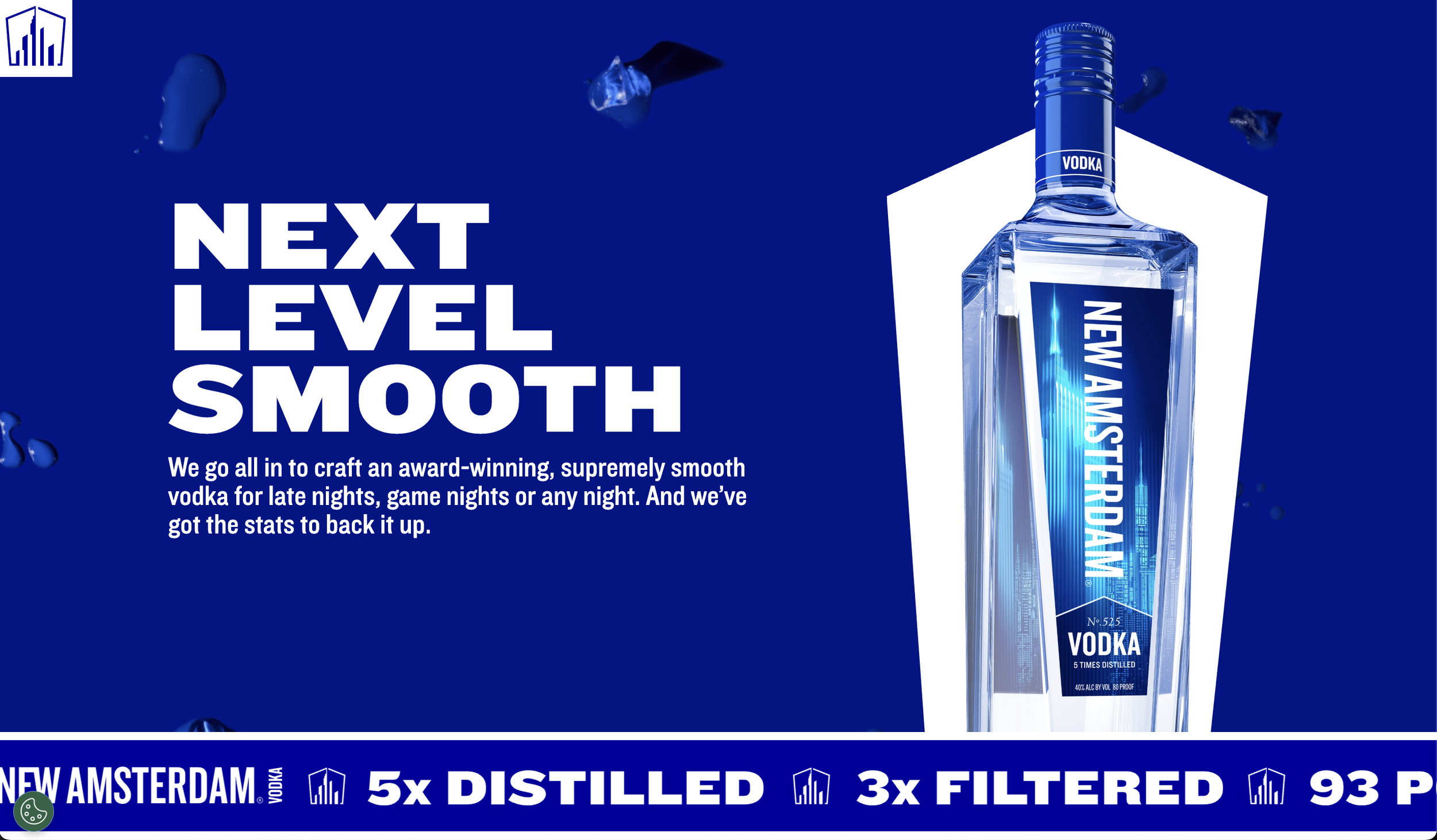 Striking design and animation of the homepage experience, using dynamic transitions and bold visual elements to reflect New Amsterdam Vodka’s confident and contemporary brand identity.