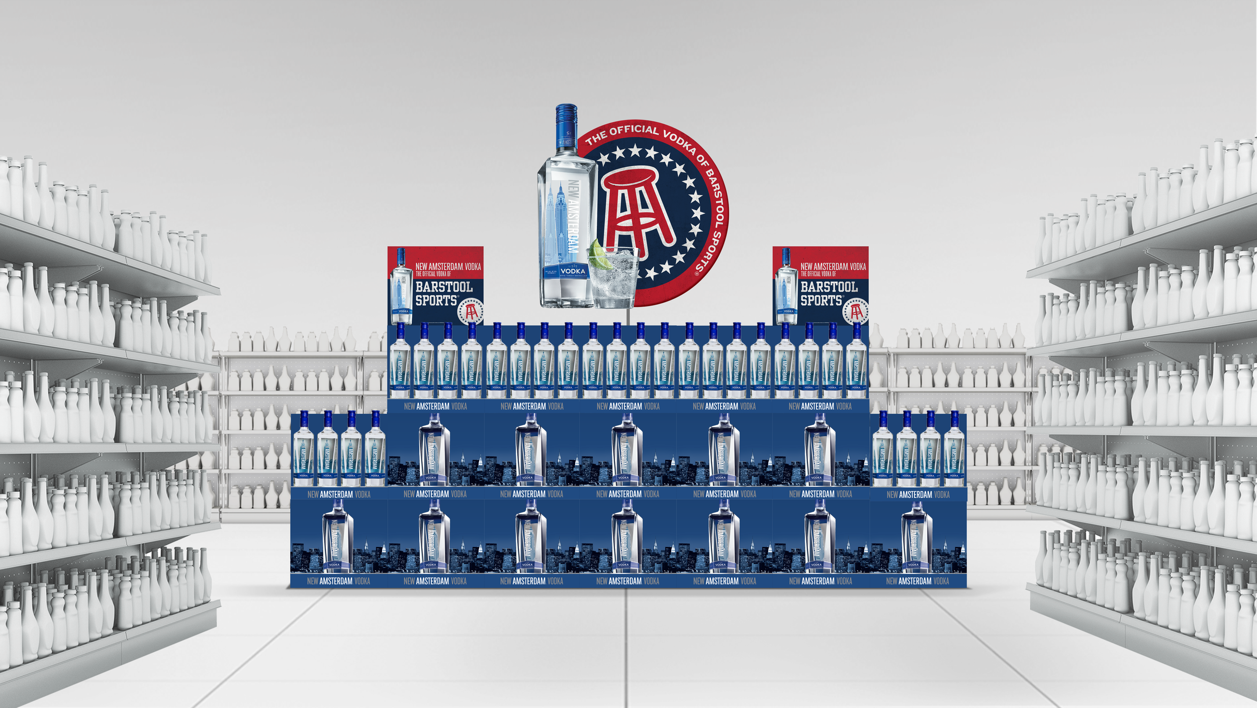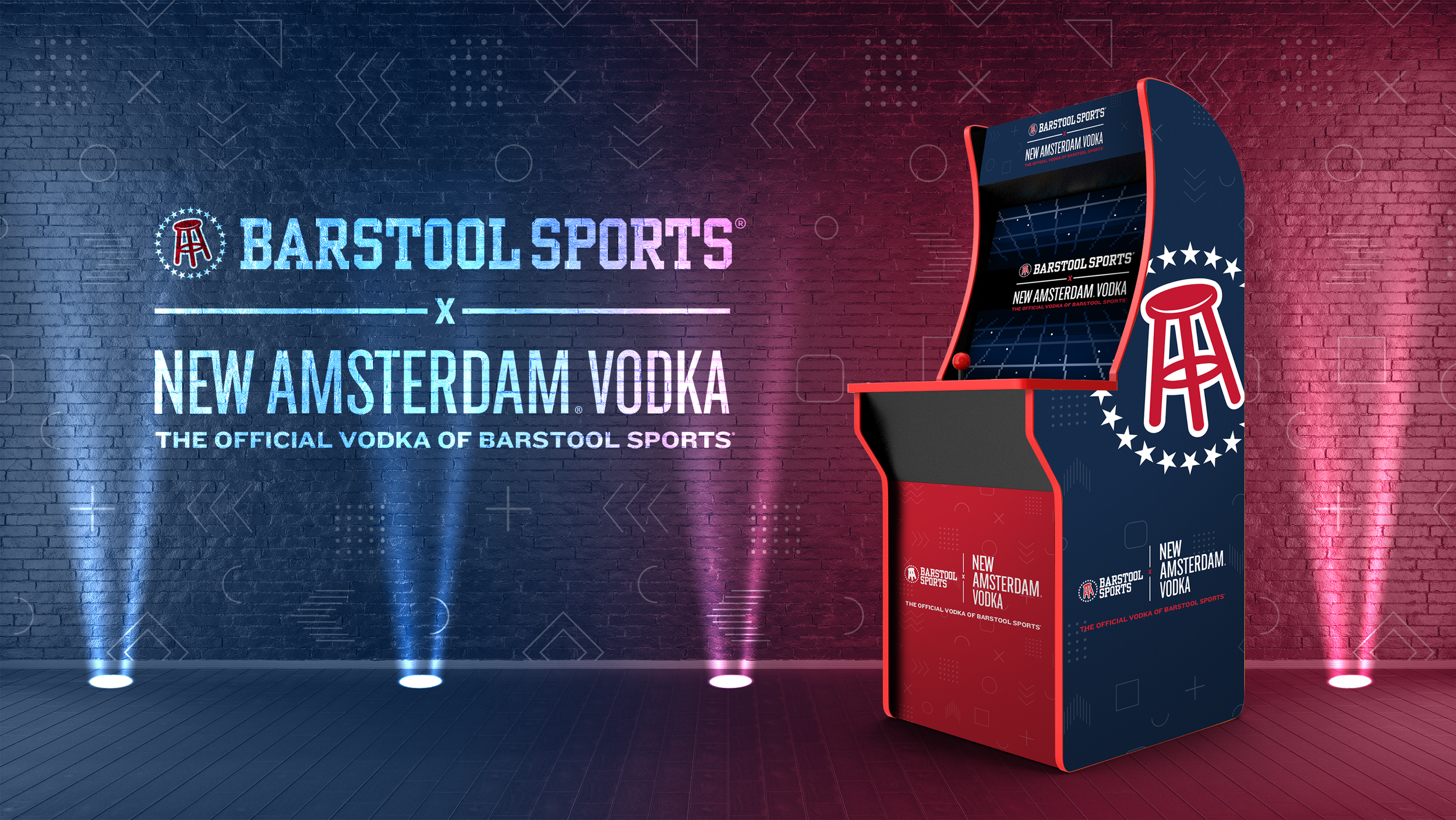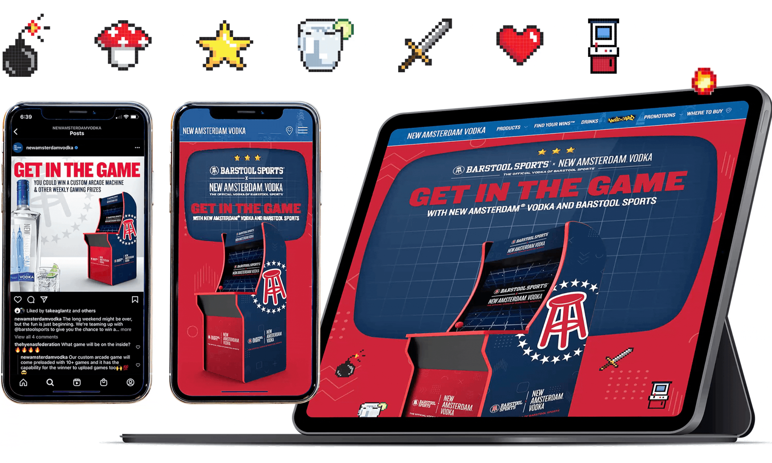 Art direction for New Amsterdam Vodka and Barstool Sports 2022 summer retail promotion that featured a custom wrapped vintage arcade cabinet with over 2000 preloaded games. Key art was developed and applied to a suite of retail elements (carton rider, table tents, social assets, etc.) that guided consumers to a promotional sweepstakes page on NewAmsterdamVodka.com that allowed them to enter for a chance to win.